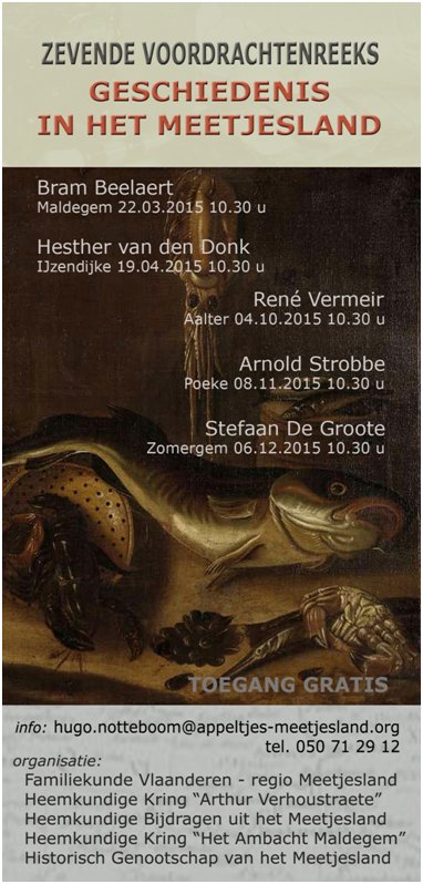 Zoals ieder jaar hebben wij ook in 2015 het genoegen u uit te nodigen op een aantal historische lezingen, georganiseerd door : Heemkundige Kring “Het Ambacht Maldegem” Heemkundige Kring “Arthur Verhoustraete” Heemkundige Bijdragen uit het Meetjesland Familiekunde Vlaanderen – Meetjesland Historisch Genootschap van het Meetjesland Klik op de foto om de folder in groot formaat…